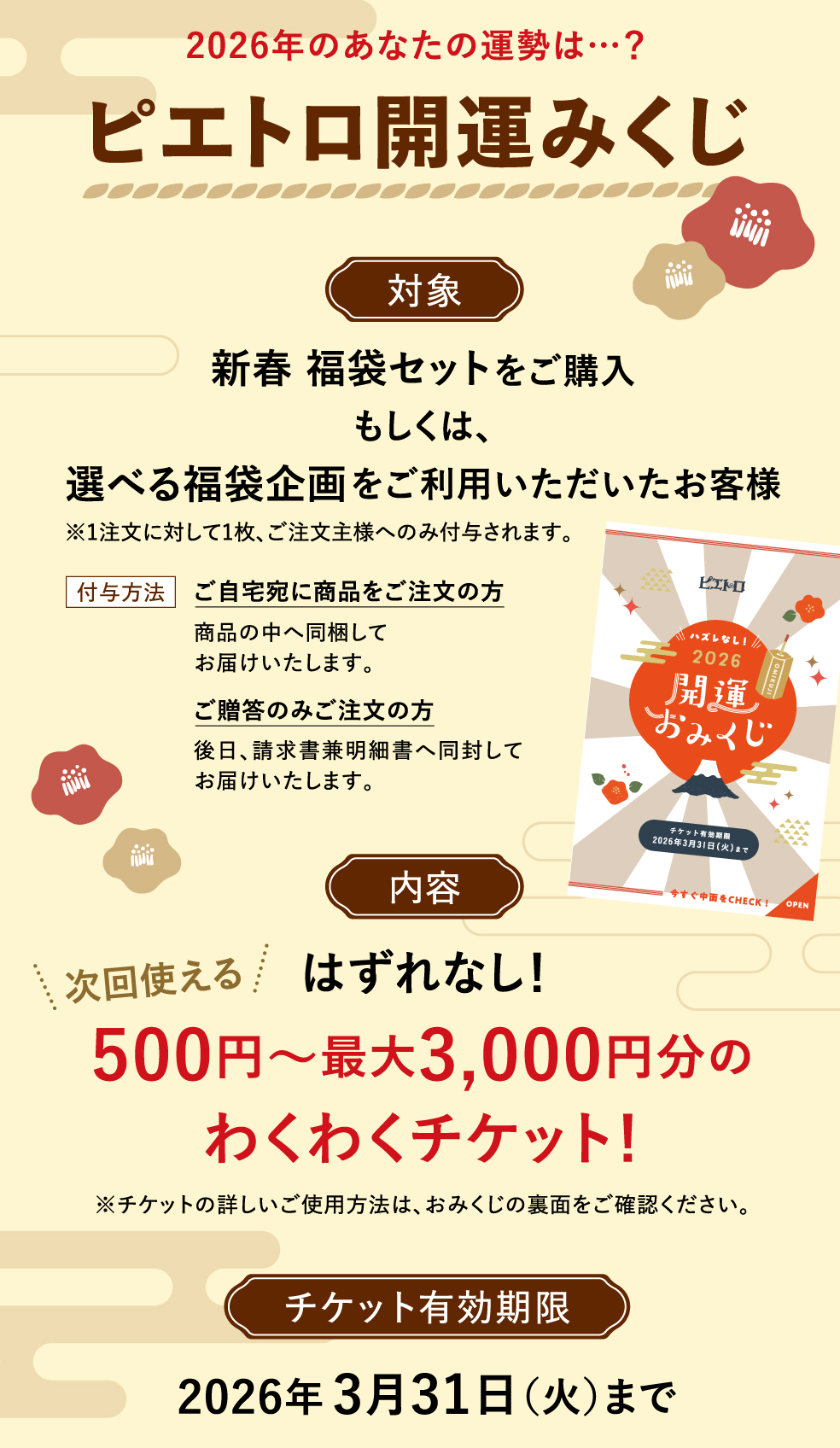 ※開運みくじは「福袋」と「冷凍商品6コ以上」を同時にご注文の場合でも、1枚のみの付与となります。 ※送料にはご利用いただけません。 ※お釣りはでませんのでご了承ください。 ※他チケットとの併用はできません。