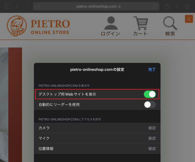 ご利用のタブレットにおいてスマートフォン用サイトを表示する設定をお願いいたします。【スマートフォン用サイト表示の設定(Safariの設定)について】