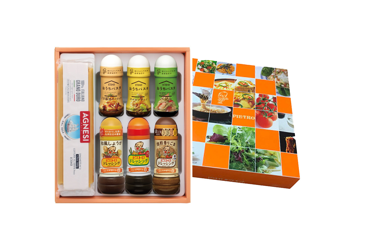 秋冬限定の「ピエトロドレッシング 和風しょうが」を含む人気のドレッシング3種類と、手作りパスタをおうちで手軽に楽しめるボトル入りパスタソース「おうちパスタ」が3種類、さらにパスタ麺(500g)を詰め合わせました。