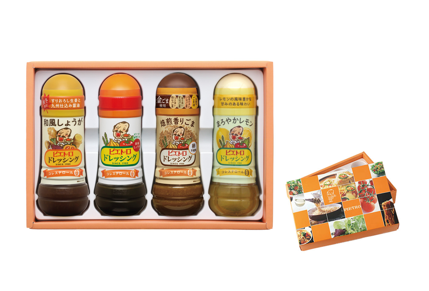 風味豊かな黄金(こがね)しょうがに、ゆず胡椒をあわせた「ピエトロドレッシング 和風しょうが」をはじめ、創業当時から人気の「ピエトロドレッシング 和風しょうゆ」など、ピエトロ自慢のドレッシング4本を詰め合わせました。