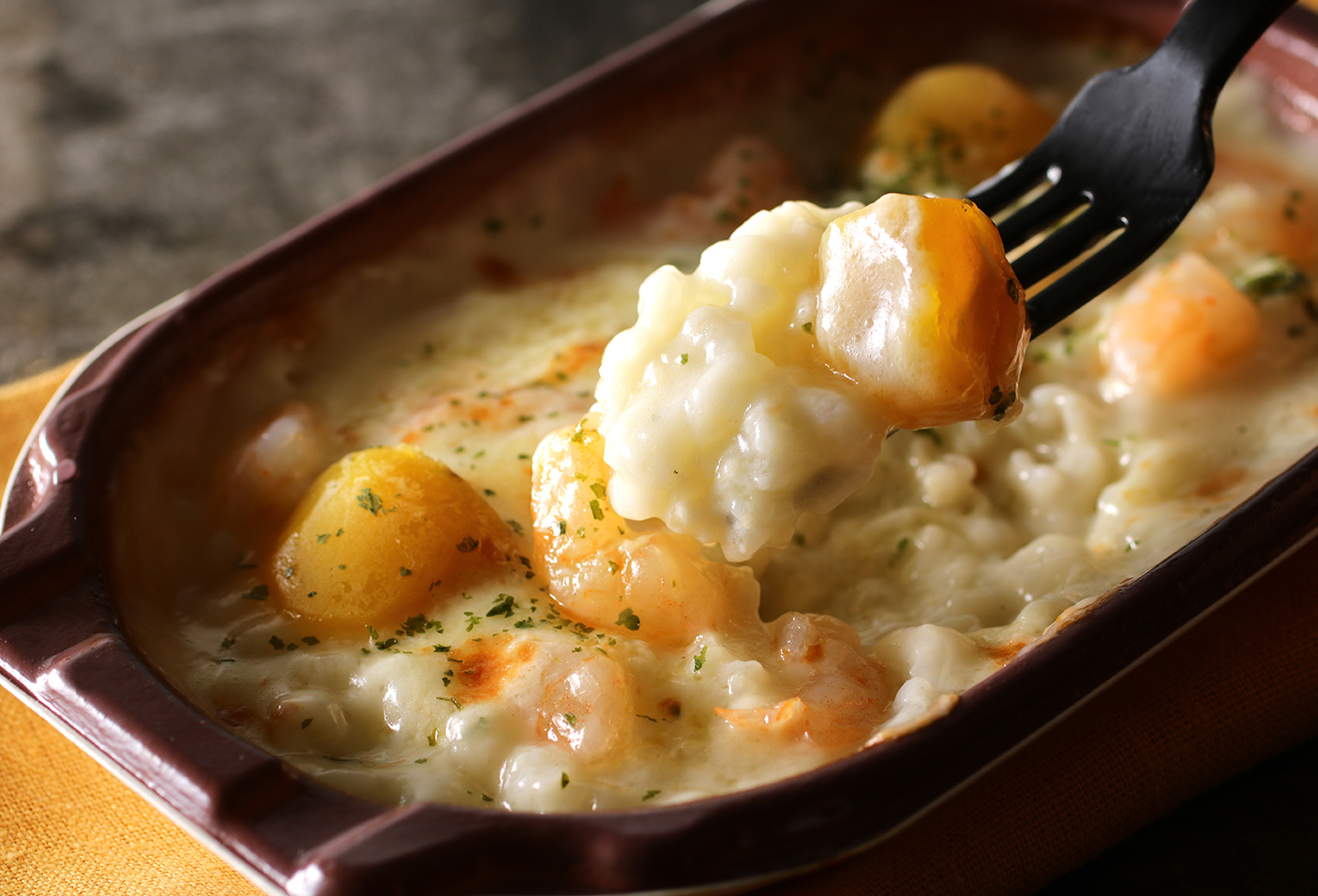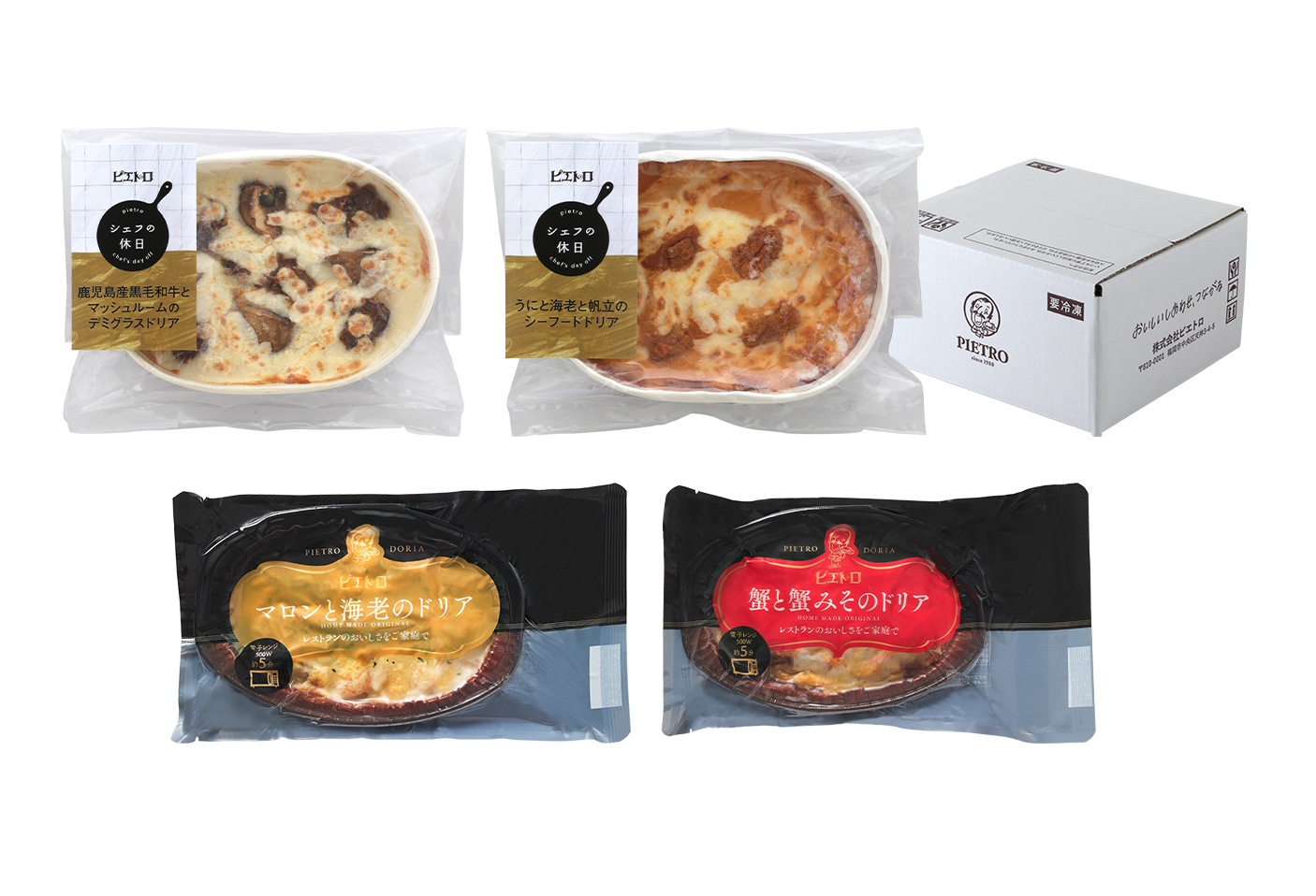 数量限定の贅沢ドリア「鹿児島産黒毛和牛とマッシュルームのデミグラスドリア」と「うにと海老と帆立のシーフードドリア」をはじめ、ほくほくとした大粒の栗にぷりぷりの海老をあわせた秋冬限定「マロンと海老のドリア」など、限定商品と定番人気のドリアを4種類詰め合わせました。