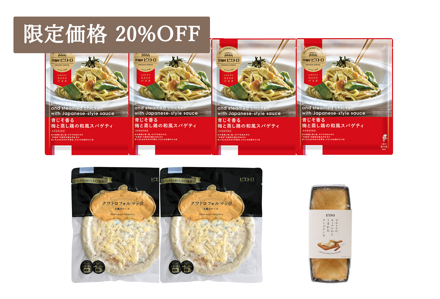 紀州産梅と蒸し鶏、オクラをあわせた“和素材”の絶妙な組み合わせの「青じそ香る梅と蒸し鶏の和風スパゲティ」や、4種類のチーズをたっぷり使用したチーズ好きにはたまらない「クワトロフォルマッジ 4種のチーズ」、濃厚でミルキーなクリームチーズの風味を活かした、なめらかな口どけの「ピエトロのキッチンからうまれたチーズケーキ」など、バラエティ豊かに詰め合わせたマルシェ限定のセットです。