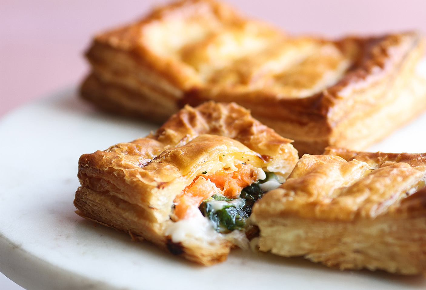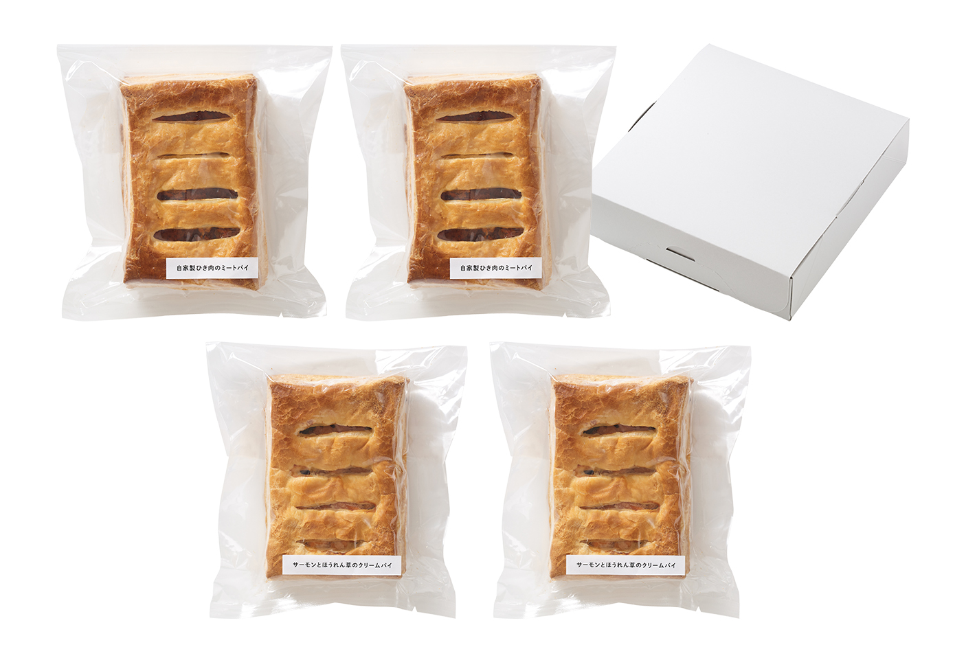 自家製ひき肉に、爽やかなトマトをあわせた「自家製ひき肉のミートパイ」と、自家製ホワイトソースに国産ほうれん草を加え、スモーク風味のサーモンをあわせた「サーモンとほうれん草のクリームパイ」を各2個ずつ(計4個)セットにしました。