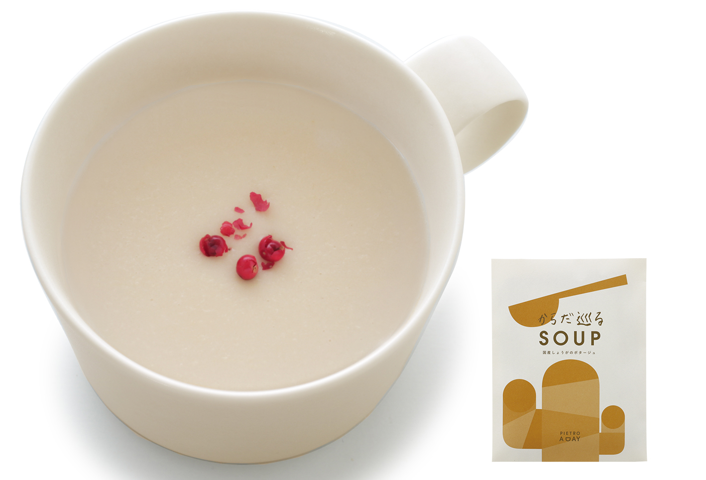 国産のじゃがいも・たまねぎのやさしい甘みが、しょうがの辛みをマイルドにおさえるとともに、スープを風味豊かに仕上げました。