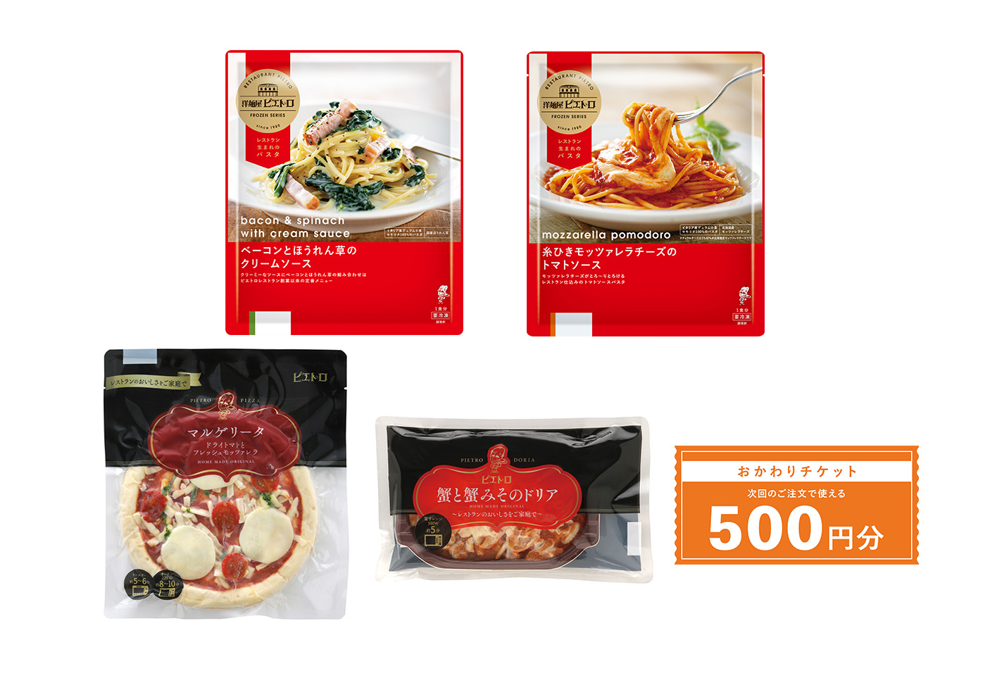 ピエトロレストランの創業メニューとして長年親しまれている「ベーコンとほうれん草のクリームソース」や、定番人気のピザ「マルゲリータ ドライトマトとフレッシュモッツァレラ」、蟹と蟹みその旨みがぎゅっとつまった「蟹と蟹みそのドリア」など人気の冷凍商品4種を詰め合わせました。