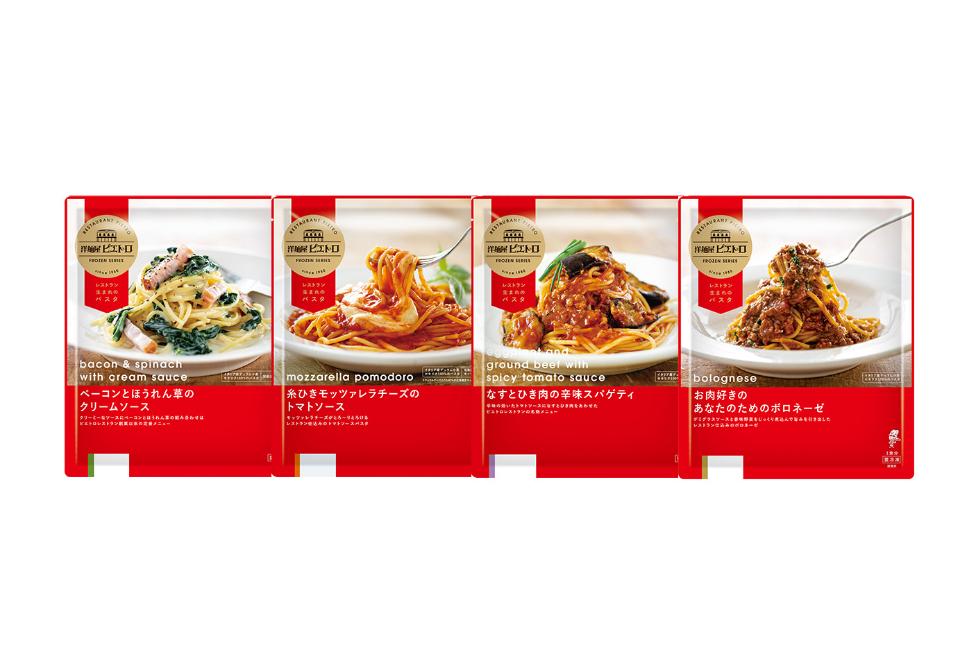 洋麺屋ピエトロシリーズの冷凍パスタをはじめてお召し上がりいただく方に、ぜひ味わっていただきたい人気の4種類をセットにしました。