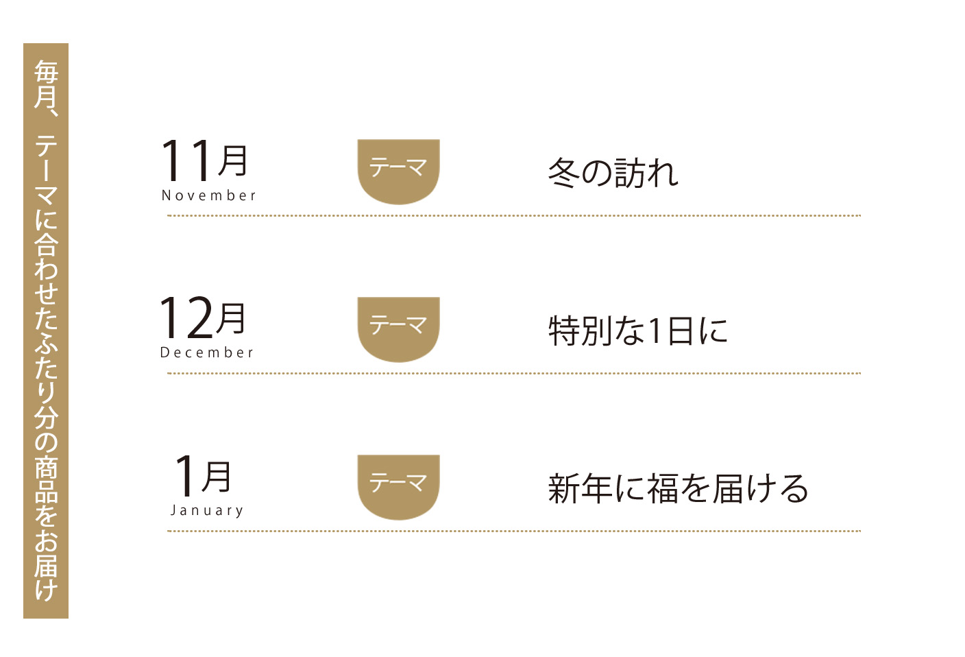 商品のお届け開始は11月から、毎月第3水曜日に発送いたします。※お届け日やお届け先の変更のご指定がある場合、発送の1週間前までにご連絡ください。