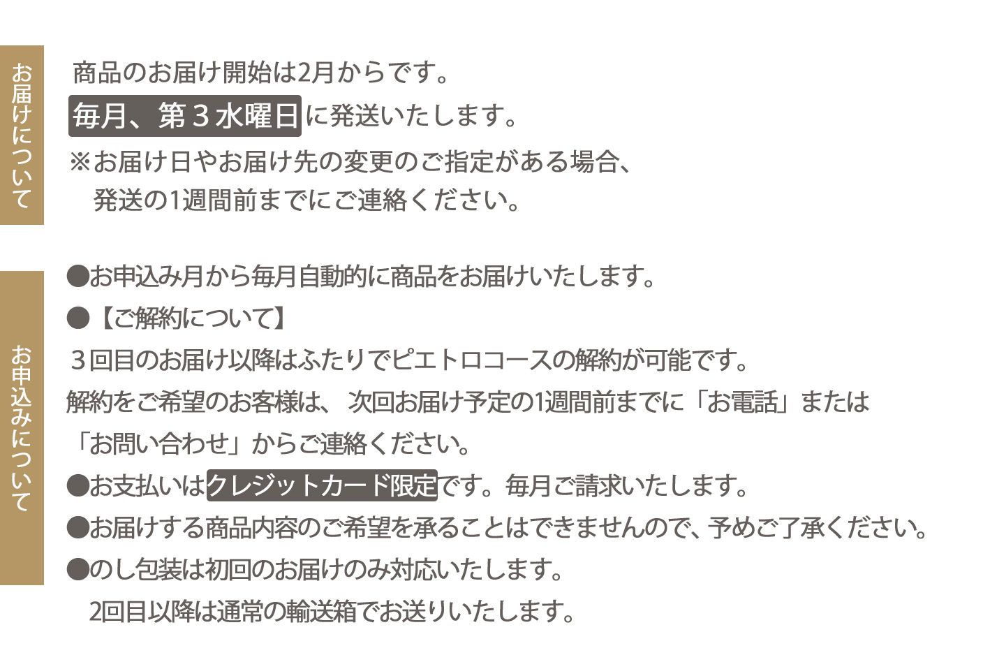 商品のお届け開始は2月から、毎月第3水曜日に発送いたします。※お届け日やお届け先の変更のご指定がある場合、発送の1週間前までにご連絡ください。