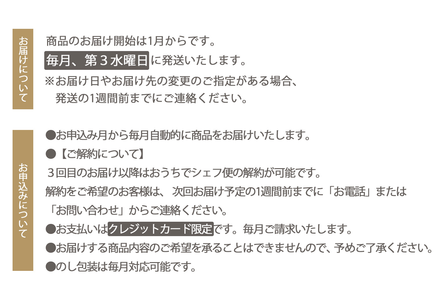商品のお届け開始は1月から、毎月第3水曜日に発送いたします。