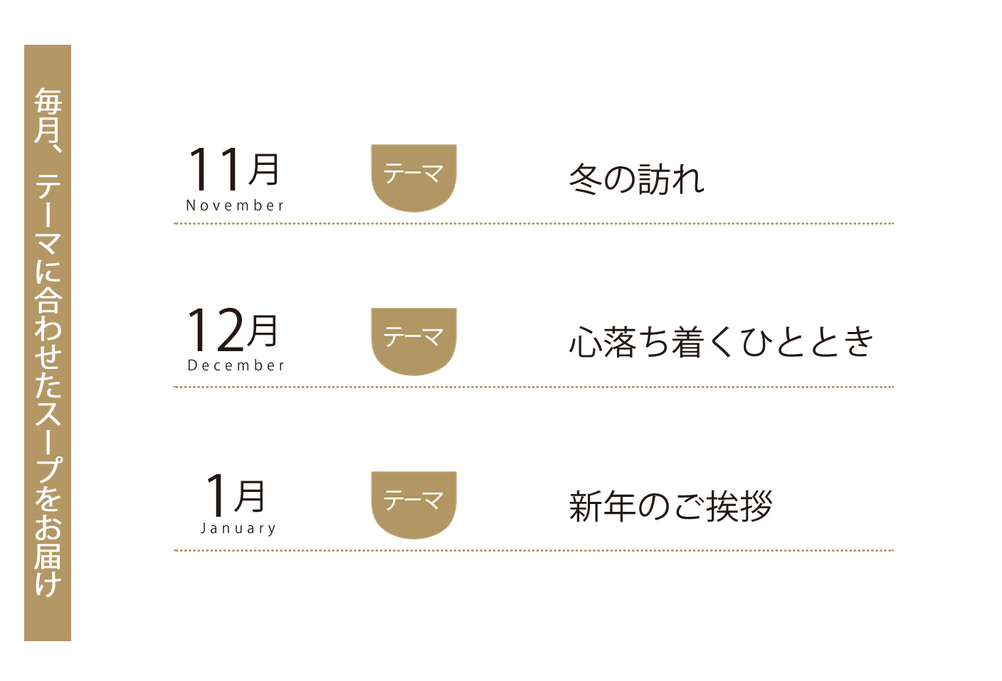 【スープの定期便】毎月、テーマに合わせたスープ10食をお届け。