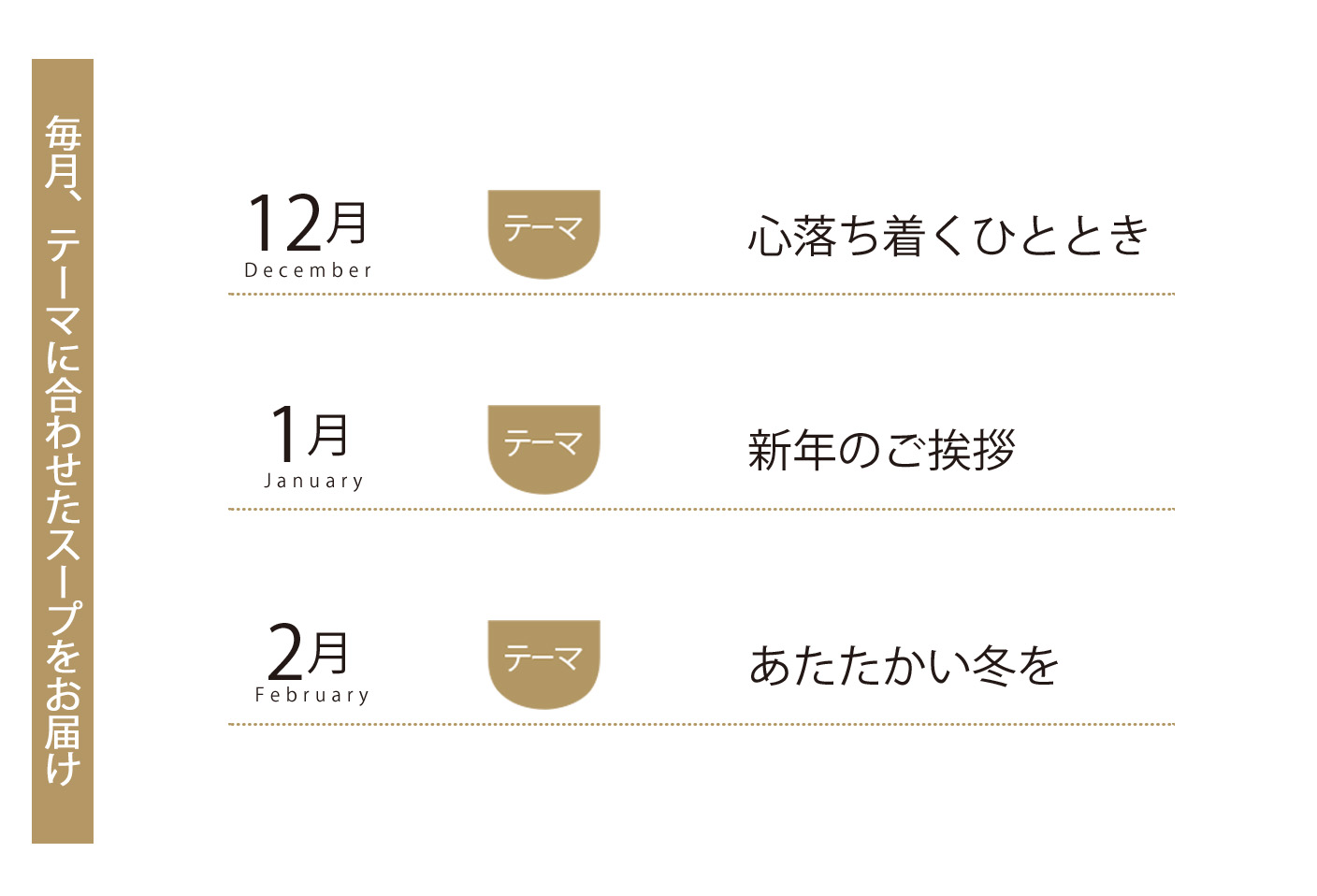 【スープの定期便】毎月、テーマに合わせたスープ5食をお届け。