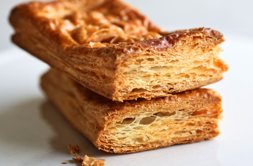 良い生地に仕上げるためには、生地の温度を適切に保つことが何よりも重要です。その日の気温によって捏ね上げる温度や生地の硬さを調整することで、層のボリューム感と軽やかな食感を生み出しています。